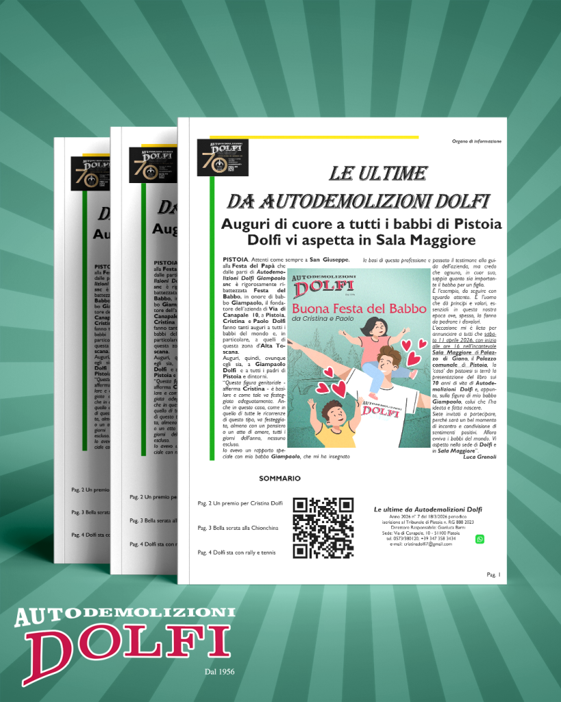 Ricordiamo che da questo mese, con la registrazione al Tribunale di Pistoia, il nostro mensile “Le ultime da Autodemolizioni Dolfi”, è a tutti gli effetti un giornale e potete contribuire anche voi fornendoci idee, consigli o suggerimenti per i prossimi numeri: SCRIVICI all’indirizzo di posta elettronica cristinadolfi7@gmail.com!