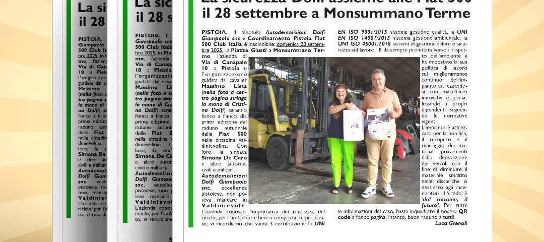 Il binomio Autodemolizioni Dolfi e Coordinamento Pistoia Fiat 500 Club Italia è inscindibile e domenica 28 settembre 2025 saranno fianco a fianco alla prima edizione del raduno autunnale delle Fiat 500, in Piazza Giusti a Monsummano Terme.